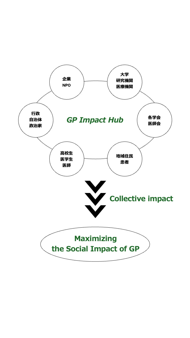 私たちは、総合診療医 Generalist Physicianです。私たちの仕事 General Practiceは、人を診て、地域を診て、人の健康や幸せに尽くし、人が健康で幸せに暮らせるような地域の成熟に貢献することです。そして、私たちGPの特性は、地域の人の声に耳を傾け、地域と医療のハブとなり、共創の輪を広げていくことです。GP Impact Hubは、この共創を加速するシステムです。私たちは、セクターや専門性、国と地域を越境し、かつてないほどのCollective Impactを創出することで、人が健康で幸せに暮らせる、自立分散型の成熟した地域社会を実現します。